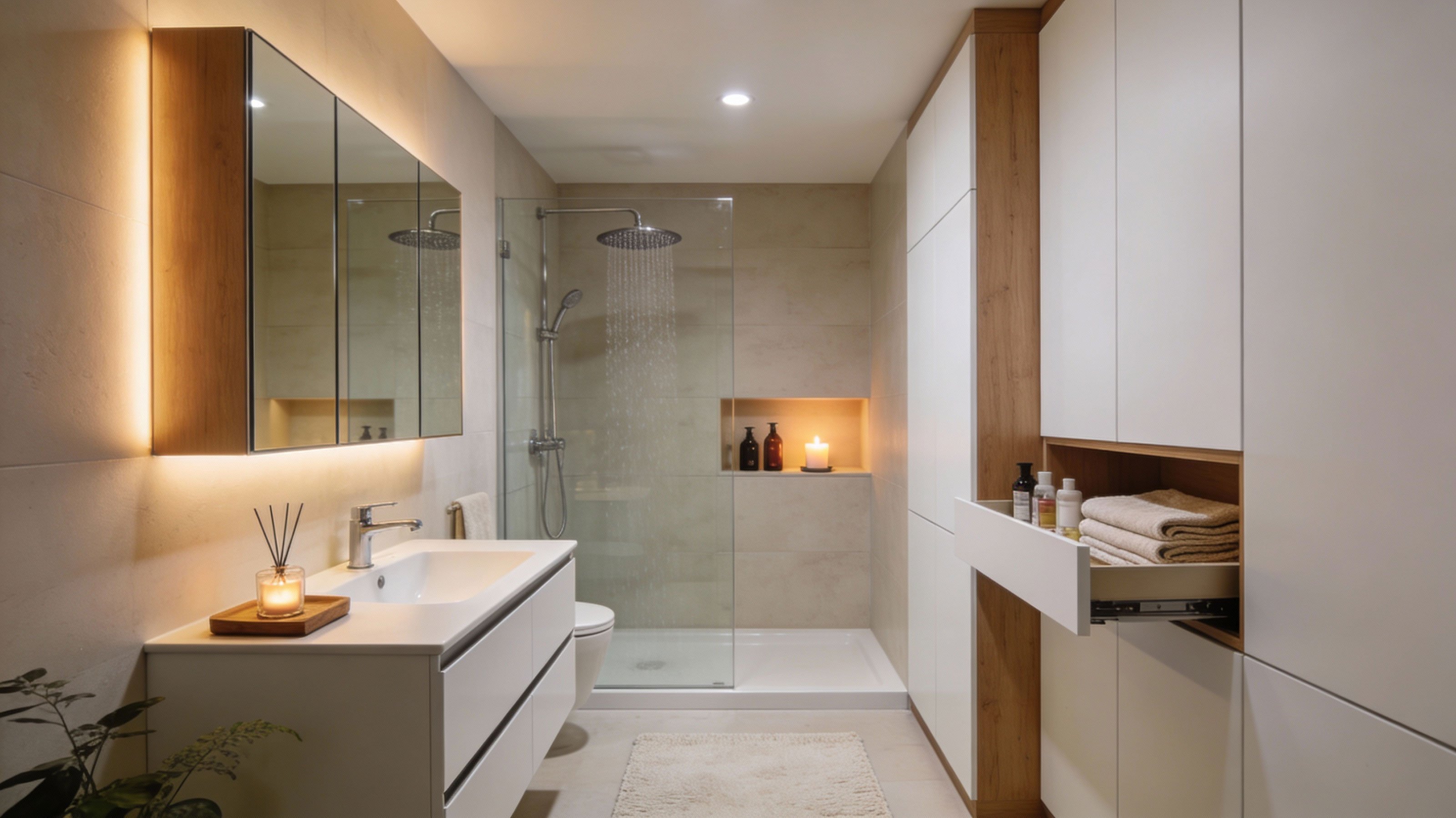 Entdecken Sie, wie Sie Ihr Mini-Bad mit platzsparenden Dusch-WCs, Walk-in-Duschen, cleverem Stauraum, stimmungsvoller Beleuchtung, Musik und Düften in eine echte Spa-Oase verwandeln.