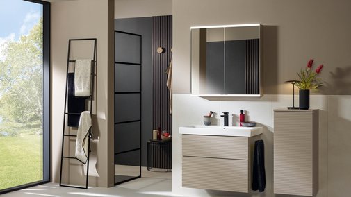 Entdecken Sie die neue 3way-Struktur von Sanipa: horizontale, strukturierte Fronten, Push-to-Open-Funktion und hochwertige Materialien für stilvolle Badmöbel.