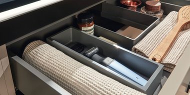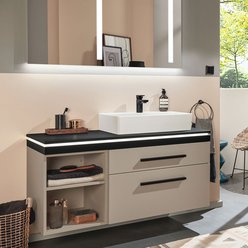 Extra-Slim, Slim-Light, Slim, Massivholz, Classic und Light in unterschiedlicher Optik – modellabhängig mit oder ohne LED, zusätzlich in Bi-Color. Flexible Gestaltung mit breiter oder schmaler vertikaler Platte. Fronten wahlweise mit Griff, mit Griffleiste oder grifflos mit integrierter Technik Push to open. Clevere Details wie ein Wäschebehälter im Schrank, eine Sitztruhe für mehr Komfort und vieles mehr. Maßflexible, offene Regale in nahezu allen Breiten ermöglichen auch in schwierigen Raumsituationen die passgenaue Planung. Verschiedene Keramik-Becken oder edle Glas-Waschbecken wählbar. Imposante Auswahl an Größen, Formen, Materialien und Farben für jeden Einrichtungsstil