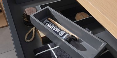2morrow bietet ein flexibles Baukastensystem für die individuelle Badgestaltung. Die Basis bildet eine elegante, variable Platte in sechs Ausführungen, die als Fundament für Aufsatzwaschtische dient. Dieses System wird ideal durch Unterschränke, Anbauschränke und Regale ergänzt, die vielfältigen Stauraum schaffen.